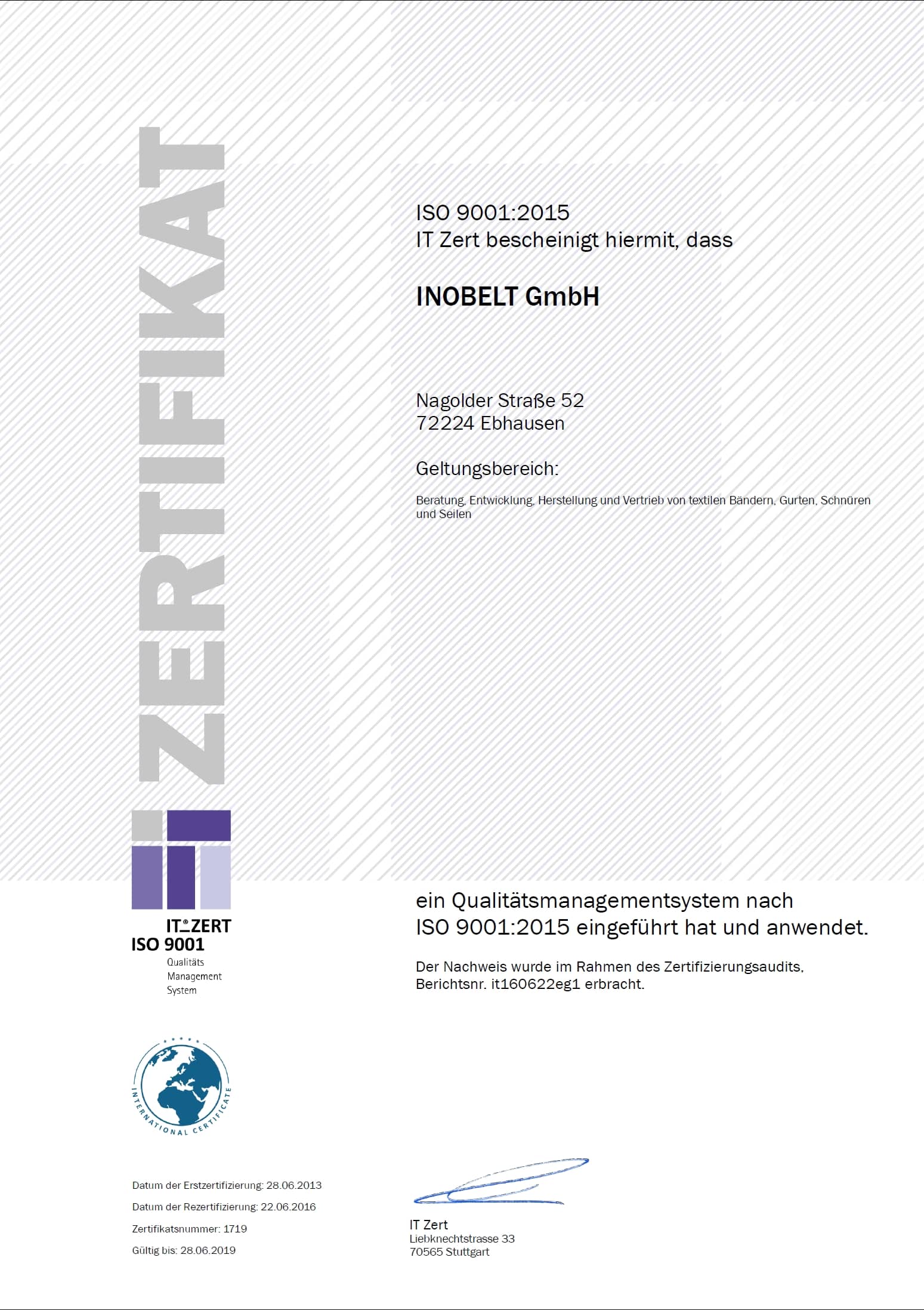 Вся продукция INOBELT с 2015 сертифицирована по стандарту Эко-Тех 100 (OEKO-TEX Standard 100)
